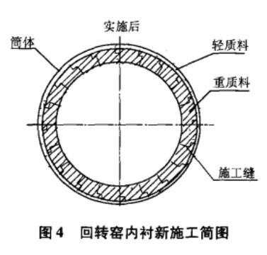 經(jīng)過與原料廠家、大修部門對該問題的共同探討,較確定將原有兩條澆注料之間的直縫施工修改為有錯臺的施工縫,阻擋在高溫條件下高溫炭粉由施工縫進入輕質(zhì)料層。回轉(zhuǎn)窯內(nèi)襯新施工簡圖見圖4。此項措施較明顯地改善了內(nèi)襯的使用狀況,次采用就使回轉(zhuǎn)窯內(nèi)襯的使用壽命提高到了440天以上。
