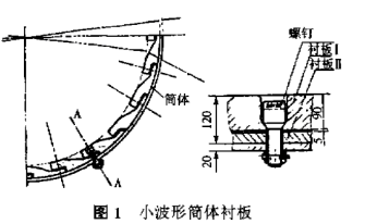 在簡(jiǎn)體橫斷面上,沿筒體圓周有24塊小波形襯板一塊壓著一塊,格子型球磨機(jī)每塊用2只M36螺釘與筒體固定,相鄰倆塊在筒體長(zhǎng)度方向上的間隙錯(cuò)開(kāi),格子型球磨機(jī)通過(guò)長(zhǎng)期對(duì)其使用和失效情況的考察發(fā)現(xiàn),失效報(bào)廢幾乎都是因螺釘松動(dòng)引起格子型球磨機(jī)筒體漏砂。